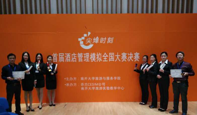 2016年12月13日至15日,由南开大学旅游与服务学院主办、芬兰Cesim科技承办的首届“尖烽时刻”酒店管理模拟全国大赛在南开大学举行决赛,我系旅游管理专业的王林琳、王晓宇等七位同学(2支队伍)在王维胜、李鹏学二位老师的带领下,认真钻研、精心备战、同心协力,经过多轮比赛,取得了优异的成绩。其中“三人行”队以全部参赛队伍第二名的优异成绩获得大赛一等奖,“π组合”队荣获得三等奖,王维胜老师和李鹏学老师分别获得指导老师一等奖和三等奖。
